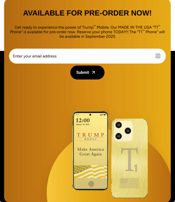 Selon le site Web associé au lancement, Trumpmobile.comle téléphone sera couleur dorée Et à l'arrière aura un drapeau américain et le logo de l'appareil, T1. Il peut également être déduit de l'image qui ressemblera très similaire à un iPhone, Avec trois caméras photo situées dans le coin supérieur gauche de l'arrière, les bords arrondis et la caméra frontale au centre de l'avant.