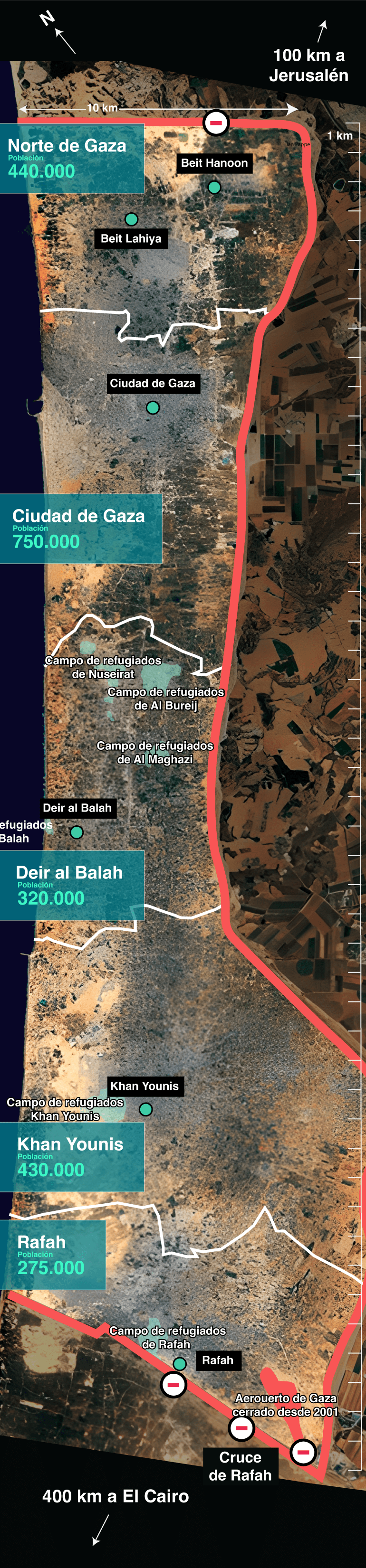 La bande de Gaza assiégée est composée de cinq districts: Gaza Norte, Ciudad de Gaza, Deir El-Balah, Jan Yunis et Rafah. L'armée israélienne a exhorté la population qui réside dans le nord de Gaza à se déplacer vers le sud. Au total, 1,1 million de personnes qui ont entrepris une évasion agonisée à pied, dans des voitures ou des animaux vers le sud d'un territoire superpoblé et en proie à des champs de réfugiés, rappel d'autres traumatismes d'exode.