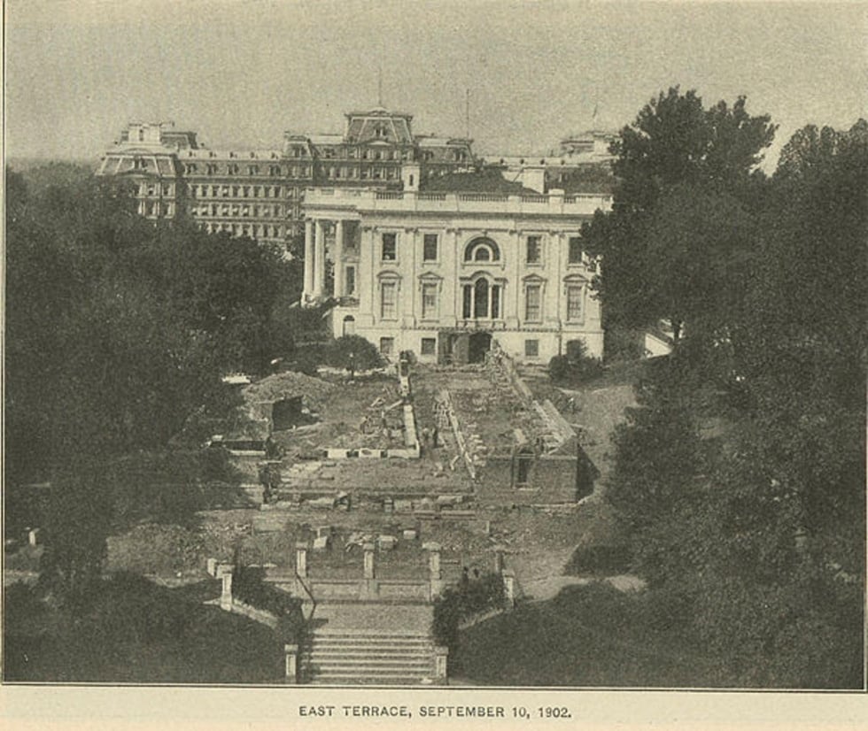 - En 1902, le président Theodore Roosevelt fit construire l'aile ouest, remplaçant les vastes serres construites à l'époque de Jefferson. Avec cette intervention, il a créé l'aile actuelle du bureau de direction avec un design d'inspiration classique. De plus, il intègre un jardin de style colonial et une terrasse orientale, un espace qui donnera plus tard naissance à l'aile Est.