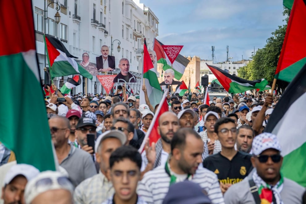 Sous le slogan « Résistance à la libération de la Palestine et la chute de la normalisation avec le régime sioniste », la foule a parcouru le centre de Mohamed V, passant devant le Parlement et la Plaza de Correos, dans une marche dans laquelle les chansons, les drapeaux palestiniens et les affiches avec des images de dirigeants du Hamas découragés par Israel ces deux années ont été publiées. Avec les cris des « les gens veulent renverser la normalisation » ou « saluer du cœur aux hommes des tunnels » – en référence aux combattants du Hamas – certains manifestants se sont déguisés en militants de l'aile militaire de l'organisation islamiste palestinienne ou ont présenté Trump et Netyahu comme « Butiteros '' de 19 000 mineurs sont morts au cours des deux dernières années de bombardement.