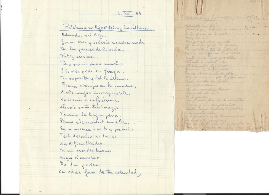 Son fils Édouard a également écrit quelques lignes qui marqueraient sa vie, selon Rodolphe. Le 4 décembre 1944, une note est datée qui dit: « Des mots à mon fils, peut-être les derniers. » Rudolph appelle son fils « Eduardo », en espagnol, et après lui avoir demandé de ne jamais faire souffrir sa mère, « une femme incomparable, courageuse et malheureuse », il demande qu'il suive « le chemin de votre père ». Et concret: « Combattre, alors que ton père s'est battu, pour notre idée et le progrès de l'humanité. Ce chemin est difficile, mais l'objet vaut la taxe. Pour un homme qui doit être (sic) « .
