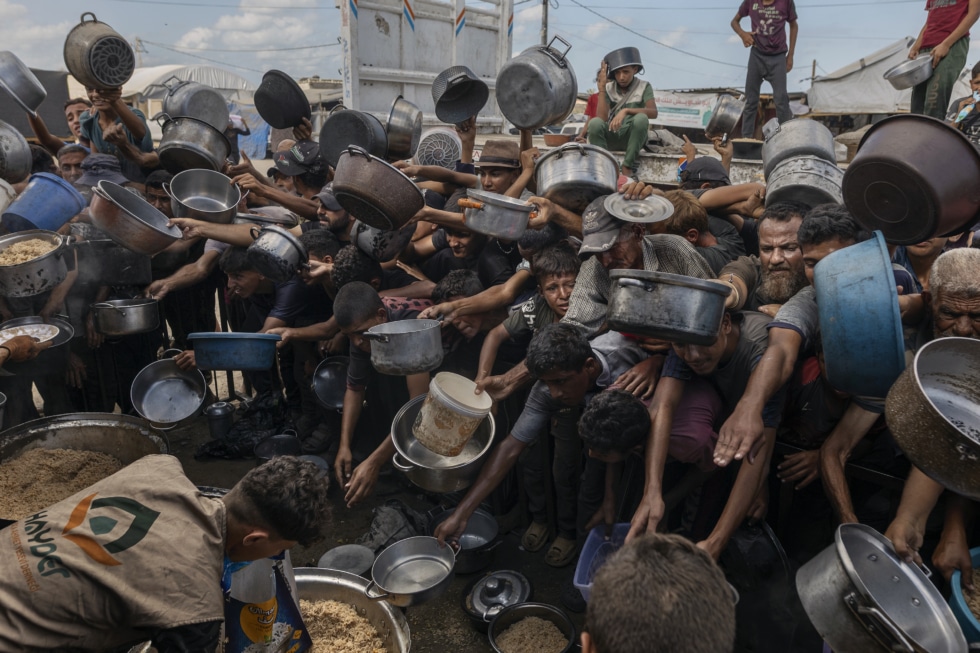 Saher Alghorra, pour le New York Times. Les Palestiniens du camp de personnes déplacées d'Al-Mawasi attendent un repas. Les cuisines solidaires locales étaient l'une des rares sources de nourriture pour les personnes déplacées. Khan Yunis, bande de Gaza, 21 septembre 2025.