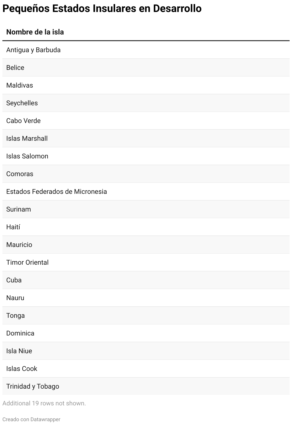 Les petits États insulaires en développement ont également joué historiquement un rôle rôle clé dans les négociations sur le changement climatiquepromouvant des étapes importantes dans l'action climatique à travers divers blocs de négociation, tels que le Alliance des petits États insulaires (AOSIS), le G77 et le Coalition à haute ambition.